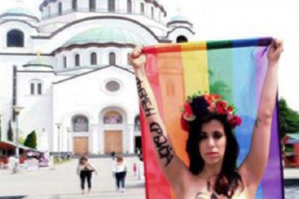 In Gay We Trust, Serbia! On this day of the Belgrade Pride Parade, FEMEN proudly stands for LGBT rights in Serbia! In front of St. Sava Cathedral where religious patriarchs led an anti-gay march this week, FEMEN opposes Serbia's notorious ennemies of equality and human rights: the christian orthodox church as well as hooligans, nationalists and fascists. Serbia remains one of the most homophobic countries in Europe. The recent history of the Belgrade Pride Parade is rooted in violence, just like LGBT people's lives, as they suffer from both the attacks by hooligans and fascists and the repression of the state. In the last few years, in it's attempt to please the European Union, Serbia's corrupt government stopped banning Pride and offered its support to the LGBT people that day, acknowledging their right to march. But we cannot forget all the other days of the year, as great violence threatens whoever dares to live free as a non heterosexual or gender conforming person: people are regularly attacked and beaten, lose their jobs and communities and are ostracized from society, hopelessly seeking help from inactive authorities that don't prosecute hate crimes nor violations of human and civil rights. Serbia's LGBT people don't only face discrimination, they live in a patriarchal culture of hate and violence towards them. Too often, they live in fear. This photograph took less than a minute to take, yet the activist and photographer were attacked and beaten by a young hateful man. We congratulate and support all of those who march for equality today, love will change the world! Happy Pride Week Serbia! #InGayWeTrust #BelgradePride2016 #BgPrajd16 #LjubavMenjaSvet Photo: Lui Kloi In Gay We Trust, Serbia! En cette journée de parade de la Pride à Belgrade, FEMEN célèbre les droits des personnes LGBT et demande leur reconnaissance en Serbie! Devant la cathédrale de St. Sava, FEMEN oppose les plus grands ennemis de l'égalité et des droits humains en Serbie: l'église chrétienne orthodoxe et les fascistes, nationalistes et hooligans serbes. La Serbie est parmi les pays les plus homophobes d'Europe. L'histoire récente de la Pride est ancrée dans la violence, à l'image de la vie des personnes LGBT qui subissent à la fois les attaques des fascistes et la répression d'Etat. Ces quelques dernières années, la volonté d'intégrer l'Union Européenne a poussé un gouvernement Serbe corrompu à cesser d'interdire la Pride et à offrir support et sécurité aux personnes LGBT qui veulent marcher en cette journée de parade. Toutefois, n'oublions pas pour autant tous les autres jours de l'année, alors que la violence guète quiconque ose vivre librement en tant que personne non hétérosexuelle ou non conforme aux stéréotypes de genre. Les personnes LGBT sont régulièrement attaquées, battues, perdent leurs emplois et leurs communautés et se retrouvent ostracisées de la société. Les autorités passives et ne font pas suite aux crimes haineux ni aux violations des droits humains et civils, qu'ils ne prennent pas au sérieux. Les personnes LGBT ne sont pas seulement discriminées en Serbie, mais évoluent dans une société patriarcale où haine et violence sont dirigées envers elles. Trop souvent, ces vies sont vécues dans la peur. Durant cette photo qui a été prise très rapidement, l'activiste FEMEN et la photographe on été battues par un jeune homme devant la cathédrale... In Gay We Trust! Nous félicitons, célébrons et supportons tous ceux et celles qui marchent pour l'égalité aujourd'hui! L'amour change le monde! Bonne Pride à tous! #InGayWeTrust #BelgradePride2016 #BgPrajd16 #LjubavMenjaSvet Photo: Lui Kloi